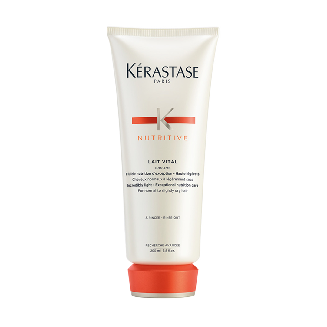 Lait Vital de Kérastase es un acondicionador desenredante ultraligero altamente nutritivo para cabello fino a medio seco. Contiene lípidos nutritivos y vitaminas que proporcionan una nutrición intensa, desenredando y suavizando el cabello seco. Lait Vital está repleto de nutrientes esenciales que aumentan la capacidad de la fórmula para nutrir y fortalecer el cabello. La poderosa fórmula liviana penetra la fibra capilar para hidratar profundamente y sella las cutículas para retener la humedad por más tiempo. Lait Vital tiene una textura de gel cremoso blanco, lo que lo convierte en uno de los mejores acondicionadores sin enjuague para cabello seco. Hasta +85%* de hidratación inmediata y nutrición 72H.
